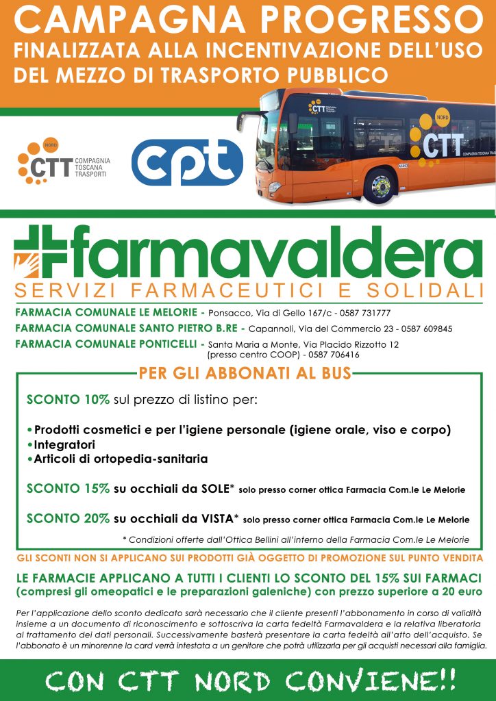 Il presidente del cda di Farmavaldera Simone Chiaverini dichiara: “abbiamo accolto con assoluto favore la proposta di CTT di stipulare una convenzione in favore dei possessori di abbonamento al servizio di trasporto autobus, già attiva in altre provincie della Toscana sulle quali CTT opera. L’iniziativa, attraverso una sinergia tra due aziende pubbliche, entrambe partecipate dai Comuni di Capannoli, Ponsacco e Santa Maria a Monte che operano sul territorio, mira a incentivare il trasporto pubblico a beneficio dell’ambiente e contestualmente ha l’obiettivo di accrescere le opportunità ed i servizi delle nostre farmacie comunali e di agevolare, anche in termini economici, le esigenze dei nostri cittadini. I punti accumulati con gli acquisti nelle nostre farmacie potranno a loro volta essere utilizzati sotto forma di buoni spesa da scalare dal pagamento di nidi, mensa e trasporto scolastico o sull’acquisto di altri prodotti”.