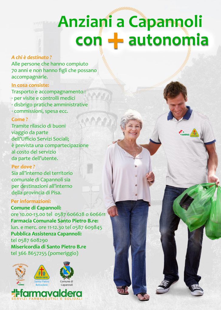 Il servizio è rivolto agli anziani che vivono soli o con il coniuge anziano, ultrasettantenni, autosufficienti ,residenti nel comune di Capannoli e privi del supporto di figli residenti sul territorio locale o che per giustificati motivi non possono accompagnarli. Ha lo scopo di sostenerli negli spostamenti anche al di fuori del territorio del comune per accompagnarli nelle eventuali attività quotidiane, per svolgere pratiche amministrative, visite e controlli medici e altre attività loro necessarie come la spesa o il disbrigo di pratiche amministrative.